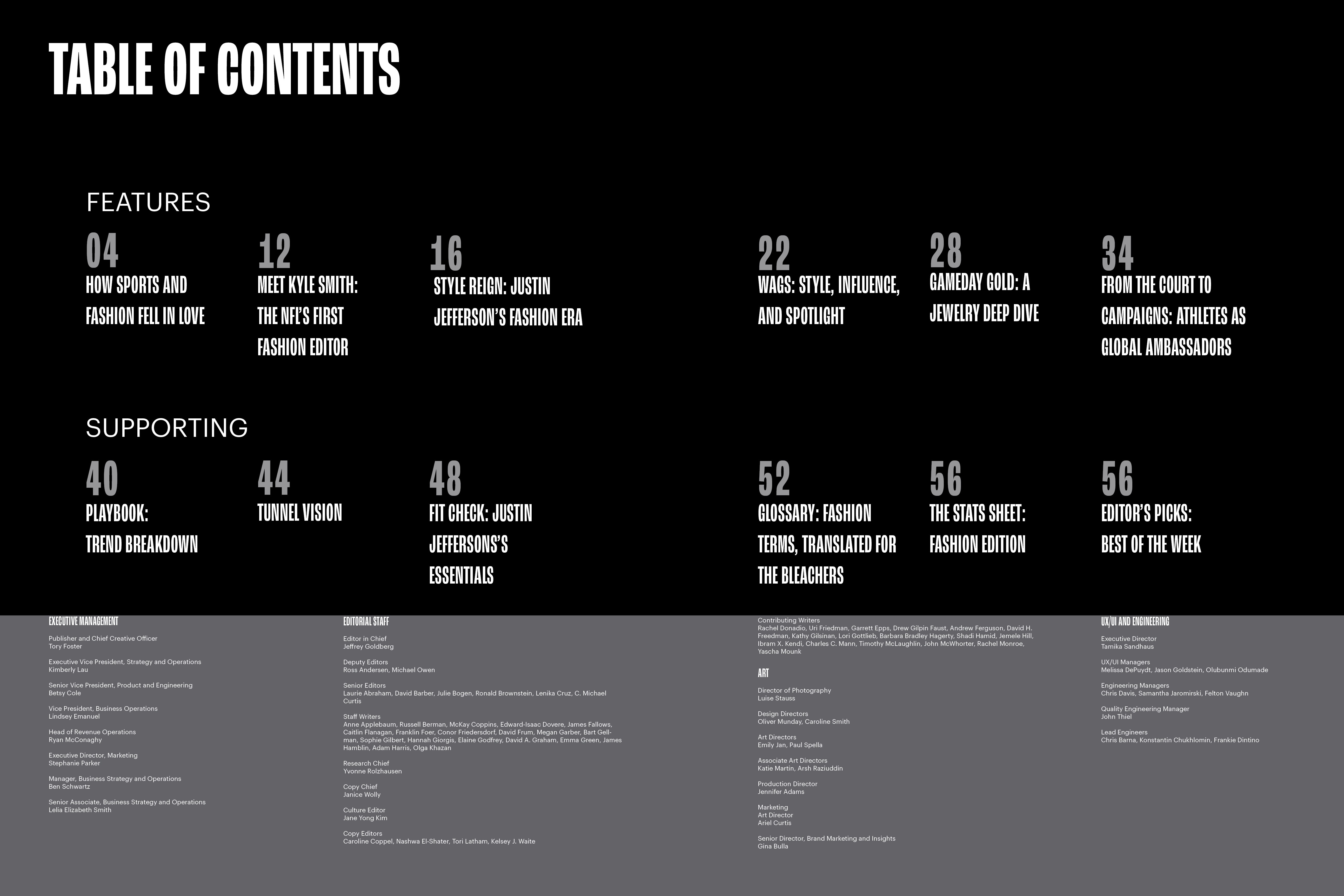 Sideline Style is a monthly print and digital magazine tracking the cross-pollination of two powerful industries—fashion and professional sports—as well as the audiences that fuel them. As lead designer I designed the magazine spreads, cover and